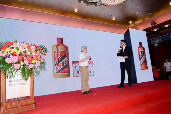 圖為中國酒類流通協會秘書長劉員和主持人在活動現場品鑒黃瓷瓶茅臺酒