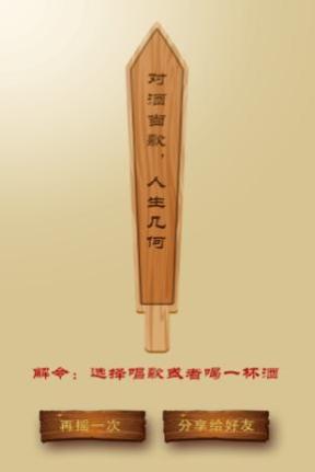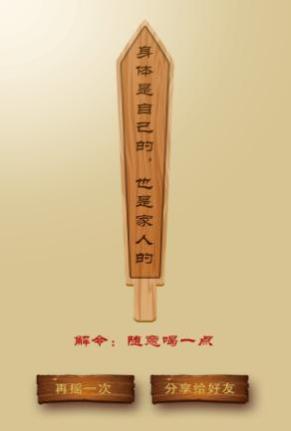 然后根據簽文,就可以機智的擋酒了。比如搖到“對酒當歌,人生幾何”,那就可以“選擇唱歌或者喝一杯酒”;搖到“身體是自己的,也是家人的”,酒可以隨意喝一點;搖到“朋友不在體‘量’,不在酒量“,酒桌上最重的人喝一點……