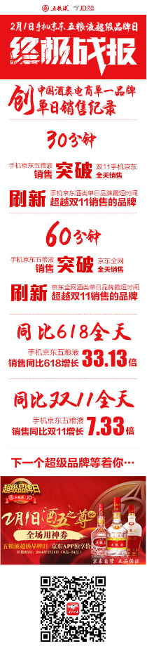 數據顯示,短短30分鐘,手機京東五糧液銷售便刷新五糧液品牌雙11當天在手機京東的銷售,刷新手機京東酒類單日品牌最短時間超越雙11銷售的品牌;上線60分鐘,五糧液在手機京東的銷售成功超越京東全網五糧液雙11全天的銷售,刷新京東全網酒類單日品牌最短時間超越雙11銷售的品牌,并成功開創中國酒類電商單一品牌單日銷售紀錄;2月1日全天,手機京東五糧液銷售同比618全天增長33.13倍,同比雙11增長7.33倍。