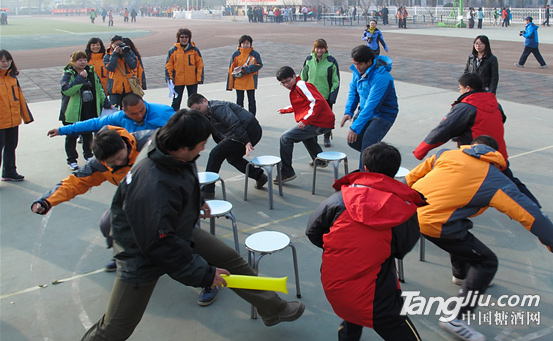 臺上置三張椅子,邀請四個人上來,放DISCO音樂,四個人伴著音樂圍著椅子轉,當音樂驟停時搶坐椅子,未坐到者淘汰;減一椅子,三個人續前動作,當音樂驟停時搶坐兩張椅子,未坐到者淘汰;最后兩人搶坐一張椅子,坐到者為勝。