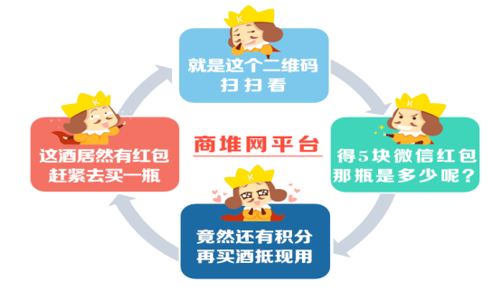 過去這個想法只能是想法,現(xiàn)在酒水企業(yè)都重視互聯(lián)網(wǎng)的應(yīng)用,有了互聯(lián)網(wǎng)這個工具,就能把想法變了做法。最簡單直接有效的方式,是以產(chǎn)品為載體,利用移動互聯(lián)網(wǎng)這個工具,實現(xiàn)與消費者鏈接。商堆網(wǎng)推出了《商堆促銷碼》這個產(chǎn)品,一瓶一碼,發(fā)微信紅包,消費者第一次掃碼得紅包和廠家積分,兌獎后再掃碼只提示產(chǎn)品信息。促銷、防偽,防串貨的同時連接了消費者。
