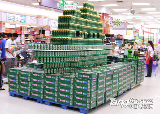 即通過商品的巧妙擺放組合出藝術造型而進行陳列。在保持商品獨立美感的前提下,通過藝術造型,使各種商品巧妙布局,相映生輝,達到整體美的藝術效果,對企業及產品的宣傳都有較強的推動作用。目前,筆者發現這種方式只在牙膏及部分食品中運用較多,部分啤酒品牌正在嘗試使用,但白酒行業尚未有企業進行嘗試。藝術陳列可以采用藝術字式、單雙層式、多層式、斜坡式等多種方式進行組合擺放,賦予商品陳列以高雅的藝術品位和強烈的藝術魅力,從而觸動消費者思想深處的藝術品味,對消費者產生強大吸引力直至其產生消費。
