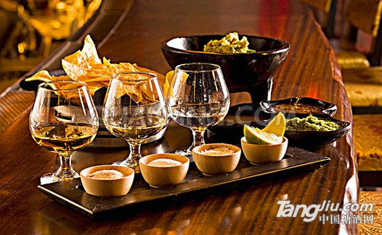 依據貯藏時間的不同,選用的品飲酒杯與飲酒溫度也不一樣。貯藏時間在2個月到1年的龍舌蘭酒稱為“Tequila Reposado”,酒體呈現淡淡的黃色,散發出微微的桶香,可以說最具有龍舌蘭酒的特征。品飲的時候最好在冰鎮之后使用凈飲酒杯飲用。而貯藏時間超過1年的奢華高級龍舌蘭,因為具有與白蘭地相似的酒體感覺,在凈飲的時候最好使用白蘭地酒杯等杯口內收的郁金香型酒杯,可以聚斂香氣,不易使酒香揮發。品飲溫度最好是常溫,因為冰鎮會使酒體香氣轉弱。
