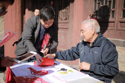 ▲ 手工老藝人向來賓展示自己為汾酒特制的剪紙作品