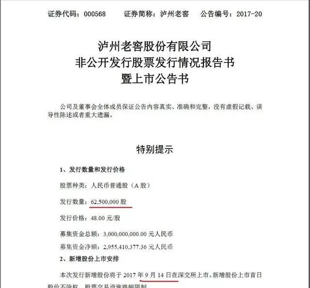 9月13日晚間,瀘州老窖(000568.SZ)在深交所發布公告稱,公司本次發行新增股份6250萬股,將于2017年9月14日在深交所上市。本次發行價格48.00 元/股,募集資金總額30億元人民幣。