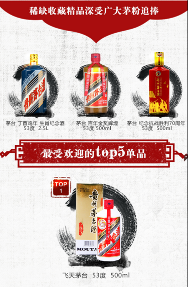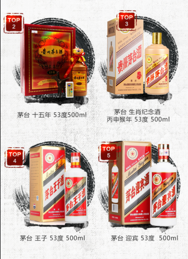 其中,最受歡迎茅臺TOP5中,第一名當仁不讓的是飛天茅臺53度,之后依次是茅臺十五年、茅臺生肖紀念酒丙申猴年53度、茅臺王子53度以及茅臺迎賓53度。