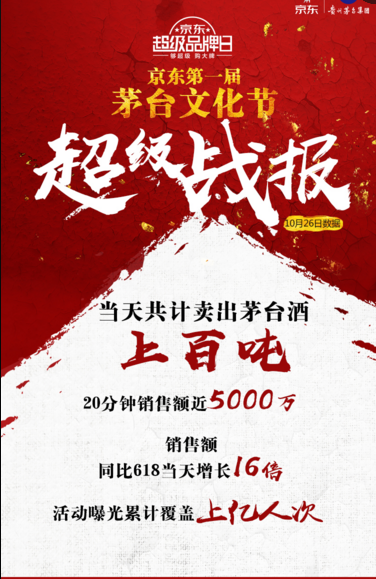 據京東平臺數據顯示,10月26日當天,京東平臺共計賣出上百噸茅臺酒,銷售額同比618期間增長16倍,活動曝光累計覆蓋上億人次。