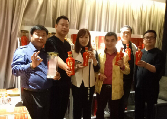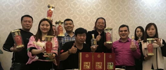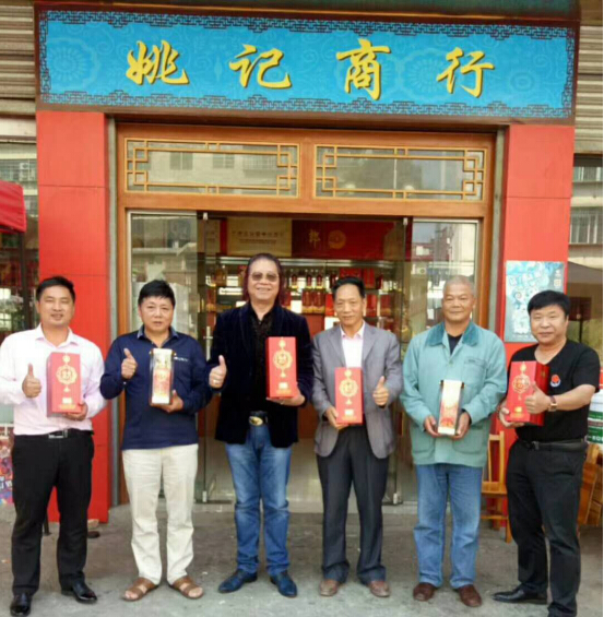 【圖為中酒協副會長、四川省酒協副會長、四川省福喜迎門酒業股份有限公司董事長王葆森先生與廣東韶關市樂昌姚奎總經理簽訂218萬元福喜迎門酒總代理后,于姚記商行門前喜捧美酒合影留念】