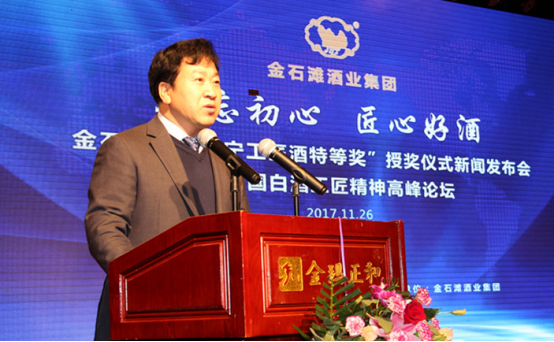 王貴玉在致辭中指出,首屆“遼寧工匠酒”評選大賽給了全省白酒行業工匠們展示才能的舞臺 。祝賀金石灘酒業集團在此次大賽中取得了驕人的成績,獲得“遼寧工匠酒”特等獎的殊榮。當前正值我國白酒產業改革、創新、轉型發展的重要時刻,金石灘酒業能取得如此成績,體現著企業領導人重視培養企業工匠人才、發揚工匠精神,釀好酒、辦好企業的決心和信心。