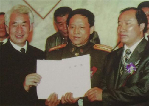 茅臺集團董事長袁仁國與時任總工程師季克良手捧茅臺神舟酒三大原料遨游太空證書