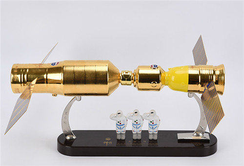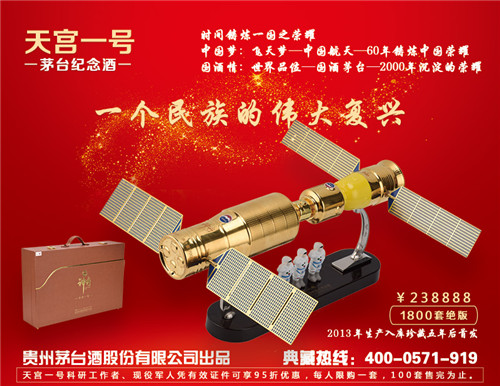 為紀念天宮一號,貴州茅臺酒股份有限公司于2013年12月隆重推出”天宮一號”茅臺紀念酒,將天宮一號與神舟十號飛船同比例縮小分別做成300ML與700ML的兩組茅臺酒拼裝組件,采用高科技全手工陶瓷燒制而成,整體呈現奢華的金色質感,并在底座上配備3名航天員的同比例模型。