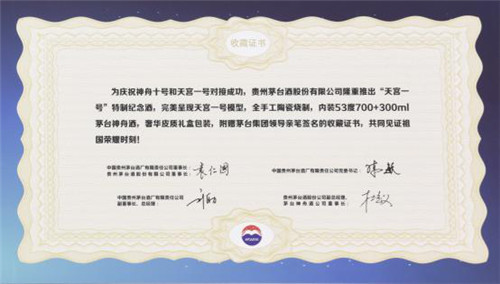為慶祝神舟十號和天宮一號對接成功,貴州茅臺酒股份有限公司隆重推出“天宮一號”特制紀念酒,完美呈現天宮一號模型,全手工陶瓷燒制,內裝53度700+300ml茅臺神舟酒,奢華皮質禮盒包裝,附贈茅臺集團領導親筆簽名的收藏證書,共同見證祖國榮耀時刻!