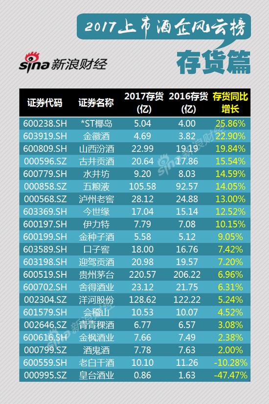2017上市酒企存貨榜:汾酒存貨庫存增35%
