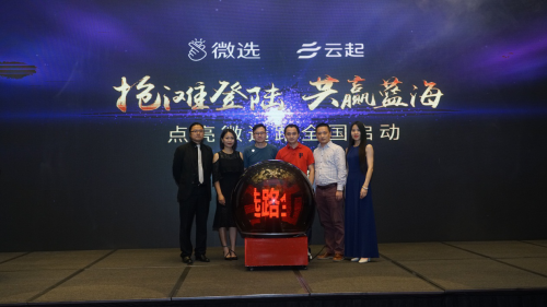 臨近大會尾聲,微選運營副總裁彌勒、微選商戶合作與市場負責人筱川、商派聯合創始人兼云起副總裁計三勇、韓后COO鄧桂英等一行上臺,在現場300多位企業家及數十家媒體的見證下,共同點亮了微選路啟動儀式球。