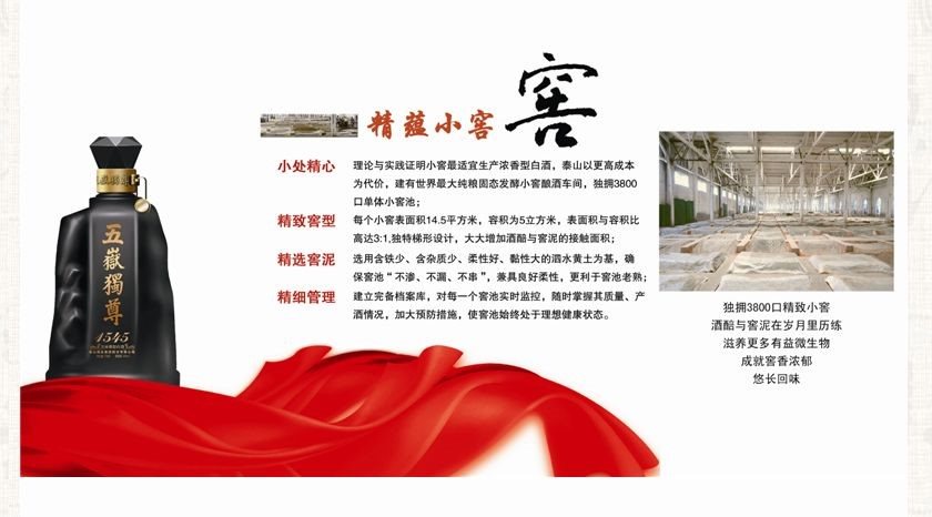 理論與實踐證明,小窖最適宜生產濃香型白酒,泰山酒業(yè)以更高成本為代價,建成了世界上最大純糧固態(tài)發(fā)酵小窖釀酒車間,3800口單體小窖池,每個小窖表面積14.5平方米,容積為5立方米,表面積與容積比高達3:1,獨特的梯形設計,大大增加了酒醅與窖泥的接觸面積,選用含鐵少,含雜質少、柔性好、黏性大的泗水黃土為基,確保窖池“不滲、不漏、不串”。酒醅與窖泥在歲月里歷練,滋養(yǎng)出更多有益微生物,獨一無二的皇家小窖,成就五岳獨尊的窖香濃郁。