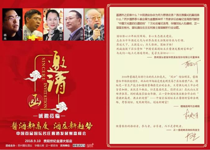 因為,這場盛大活動可謂“精彩紛呈”:既會展現白酒品類風口,又將介紹一種嶄新發展模式;既能接受一場文化洗禮,又能見證一場智慧盛宴;同時,這是一場不容錯過的財富機遇!這就是——“中國首屆國壇名莊醬酒發展財富峰會”。