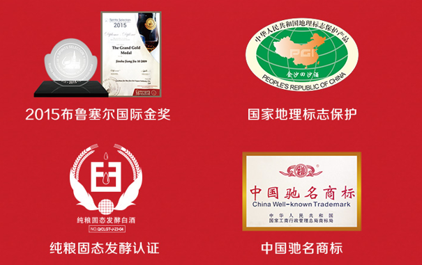 從1963年起,金沙回沙酒先后榮獲布魯塞爾國際烈性酒大賽大金獎、中國八大醬香白酒品牌、貴州八大名酒、首屆中國食品博覽會金獎、酒文化節金獎、中國十大放心品質白酒品牌、中國酒業協會科學技術獎等榮譽稱號,并通過純糧固態發酵標志認定、國家地理標志認定,標志著金沙產區正式成為貴州醬香白酒三大產區之一。