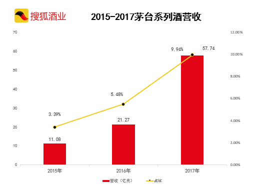 公開信息顯示,從2015年到2017年,系列酒營收連續成倍增長,2017年對茅臺整體營收的貢獻已經將近10%,增速高達171.53%。