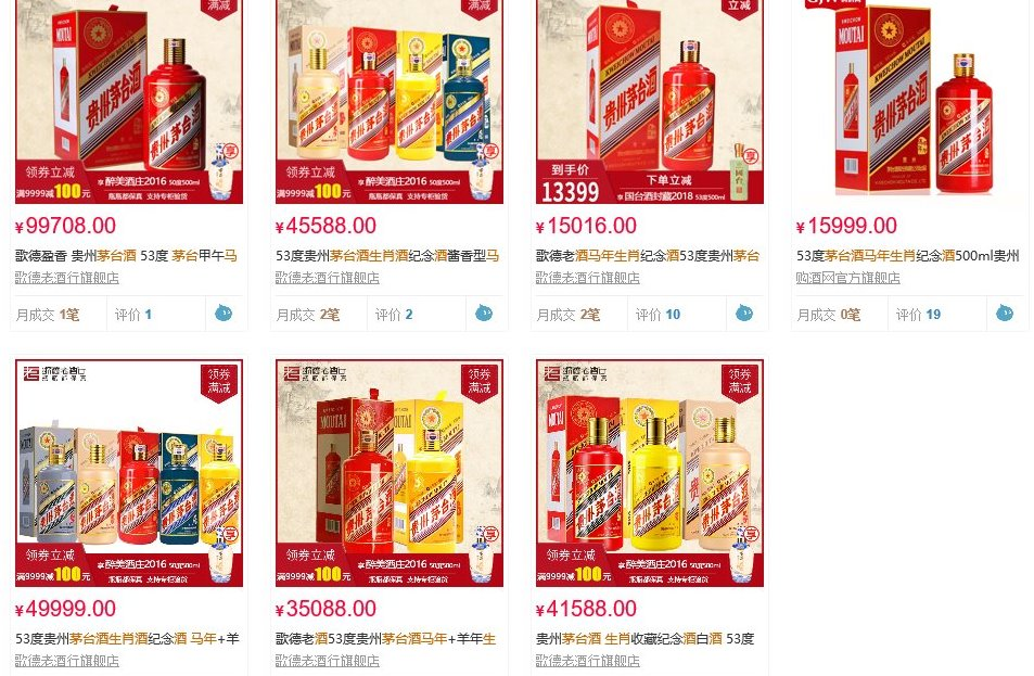 包括2018年剛剛上市的狗年生肖酒,茅臺一共發行了五款生肖茅臺酒。據了解,第一款馬年生肖酒首發價格為849元,搜狐酒業搜索淘寶等電商平臺發現,茅臺馬年生肖酒目前價格在14000-17000左右,而馬羊猴雞狗套裝甚至達到68000以上。