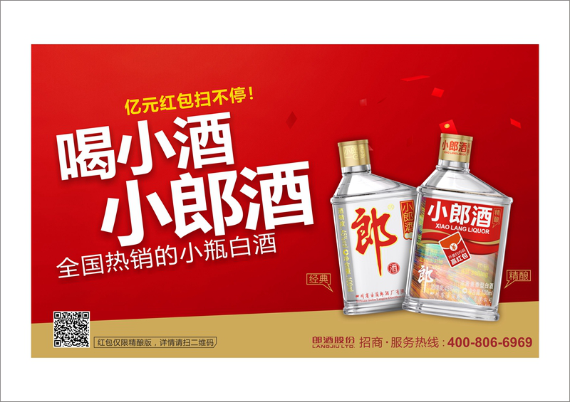 郎酒旗下的小郎酒是全國所有小酒品牌中唯一擁有專利技術的小酒,小郎酒瓶型延續家族傳統,整體呈扁平橢圓狀,頸部向左傾斜,造型新穎別致,易于手持,是郎酒首創推出的經典瓶型。新包裝瓶蓋別具一格,設有內外兩個瓶蓋,識別性強,衛生實用,更適合直飲。新包裝主體畫面設計,由正標、透標、背標三個主體部分組成,也是心意滿滿。