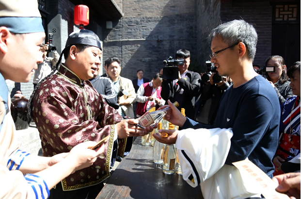 “開門迎客咯!各位客官里邊請”,循著聲音只見兩位小廝站在門口,微笑著迎賓納客。行至內(nèi)堂,汾酒眾領(lǐng)導(dǎo)客串的二掌柜熱情招呼著汾絲,一一介紹柜上的酒品名稱和特點(diǎn)。走到內(nèi)院,汾酒股份公司副總經(jīng)理、汾酒銷售公司、竹葉青營銷公司總經(jīng)理李俊客串的大掌柜推門出來致歡迎詞,并現(xiàn)場題字贈酒與汾絲合影。