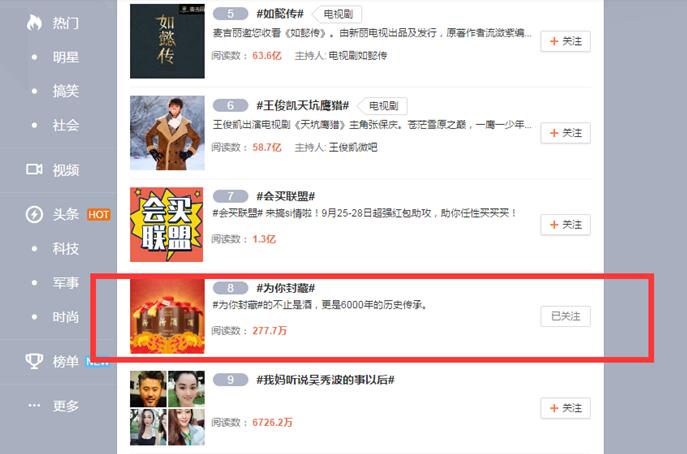 昨天,擁有6000年歷史的“汾老大”在微博上火了,包括京東、百度、海爾、匯源、海信、圓明園、中國聯通、BOSS直聘、酒仙網在內的30余家品牌微博集體向汾酒官微隔空“示愛”,吸引了超過1000萬線上用戶圍觀,還將微博話題#為你封藏#推上了微博熱門話題榜8名。