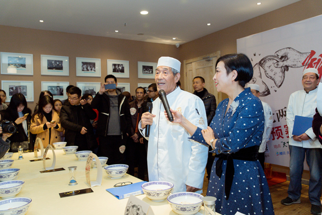 比賽這天,西安的霧霾并不能阻擋參賽選手們的熱情,下午兩點(diǎn)左右,老孫家泡饃館里人山人海,大家陸續(xù)簽到準(zhǔn)備,摩拳擦掌,準(zhǔn)備著一場(chǎng)大戰(zhàn)。這次大賽由超級(jí)受吃貨們歡迎的名嘴擔(dān)綱主持人,F(xiàn)M101.1西安亂彈《吃在西安》主持人石美,《劉翔來了》主播劉昕,一出場(chǎng)就收到了現(xiàn)場(chǎng)選手們的熱情歡呼。由王穩(wěn)記,馬樹橋,馬桂軍,王曉紅,王曉軍五位均從業(yè)30年以上的泡饃大師擔(dān)綱評(píng)委,其中兩位為國家級(jí)泡饃非物質(zhì)文化遺產(chǎn)傳承人。老師傅們?cè)诂F(xiàn)場(chǎng)講述了和泡饃的淵源,更是給大家分享了掰饃的技巧,引起了現(xiàn)場(chǎng)的陣陣歡呼。