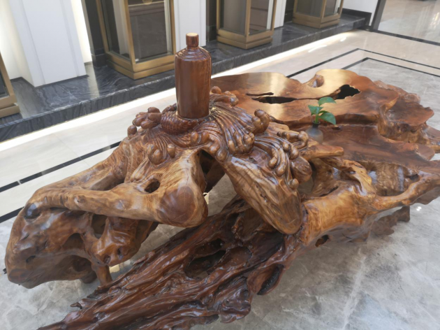 走進(jìn)一樓大廳,茅臺酒文化氣息迎面而來,濃郁醉人。展館內(nèi)收藏的茅臺酒有數(shù)百瓶,600多種酒品,囊括了建國以來各個(gè)時(shí)期的茅臺酒,不同瓶型,不同包裝,不同斤兩,分3個(gè)大展壁分別進(jìn)行展示。還有一個(gè)展壁展示的是名家簽名的茅臺酒。各種精美獨(dú)特的酒瓶、酒缸、酒壺讓人目不暇接。除了茅臺酒展壁,還設(shè)立有茅臺醬香系列酒展示區(qū)。展廳內(nèi)還專門有一個(gè)用巨大的金絲楠木雕刻的茶朵,這張茶幾獨(dú)特之處在于原木上雕刻了精美的茅臺酒瓶。據(jù)體驗(yàn)中心創(chuàng)始人之一陳峻告訴記者,僅用于一樓展廳的各類茅臺酒,價(jià)值就超過2000萬元。