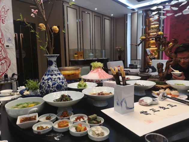 二樓餐飲區(qū)是為客人提供餐飲的地方,只有4個(gè)包房,房內(nèi)一應(yīng)設(shè)置均布局巧妙。據(jù)體驗(yàn)中心創(chuàng)始人之一管迅介紹,他們從外地請來了一個(gè)頂尖的廚師團(tuán)隊(duì),將魯菜、粵菜、川菜融入黔菜文化,打造出極具特色的新黔菜,把新黔菜色、香、味、型、器、意、境做到了極致。四匯酒文化體驗(yàn)中心探索茅臺創(chuàng)業(yè)菜品開發(fā),希望能將茅臺文化結(jié)合餐飲文化,達(dá)到在餐飲場景中尋味茅臺故事,力求讓茅臺文化真正走入普通消費(fèi)者的生活。管訊告訴記者,客人們來這兒消費(fèi),1499元價(jià)格的茅臺酒管夠。