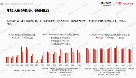 CBNData報告顯示,酒水消費中,80后、90后消費群體占比近70%。這群人到底喜歡什么白酒?這份報告稱,他們偏好低度、小包裝白酒。