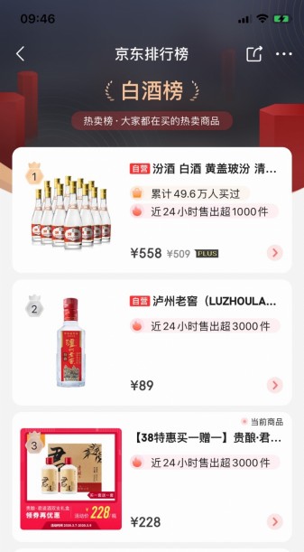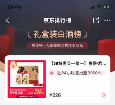 “3·8女王節(jié)”,這是春日融融笑靨如花的日子,中國(guó)貴酒集團(tuán)有限公司及旗下產(chǎn)品在京東商城,以“美酒美顏伴你一年”之約,與“女王們”浪漫邂逅,進(jìn)行一次超級(jí)硬核的滿贈(zèng)回饋活動(dòng),戰(zhàn)績(jī)?nèi)缫饬习泱@艷!活動(dòng)前的預(yù)熱及活動(dòng)當(dāng)天捷報(bào)連傳、“戰(zhàn)果”累累——連續(xù)兩天霸榜“醬香型白酒榜”,“禮盒裝白酒榜”。