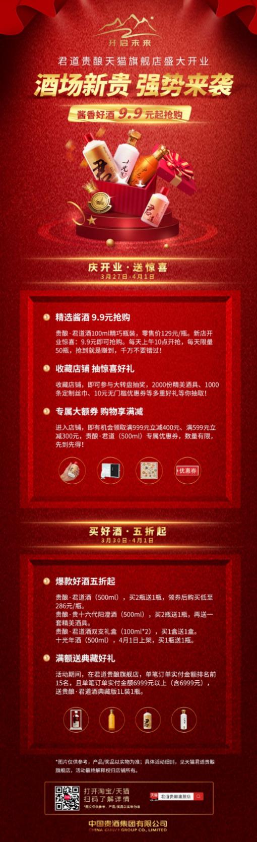 2020年3月27日,經(jīng)過精心的策劃與籌備,中國貴酒集團有限公司鼎力支持的“君道貴釀旗艦店”正式入駐天貓商城。既能享受線下的優(yōu)質(zhì)服務,又能享受網(wǎng)上渠道的優(yōu)惠價格,自此,廣大白酒愛好者們又多了一個品嘗到美酒的途徑。