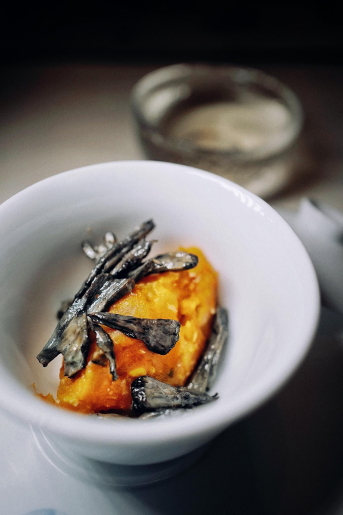 野生菌中“王炸”級別的干巴菌矜貴少有,味道當然是鮮香無比。使用上海傳統(tǒng)菜素蟹粉,用微酸自帶鮮的胡蘿卜和土豆泥等炒制而成,釋放酸甜口感。雖與干巴菌混搭,但兩者之間層次分明,讓人回味無窮。