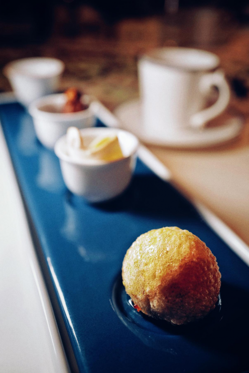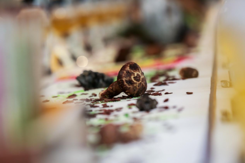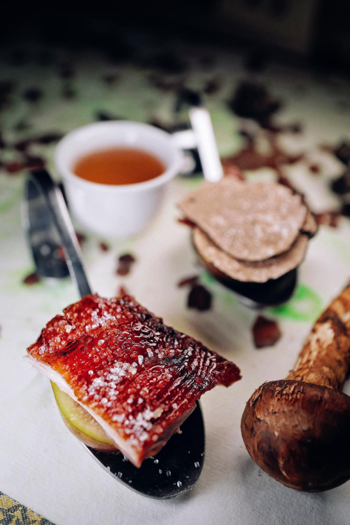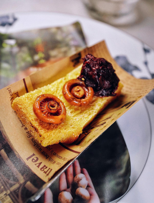 前菜入場。墊底的面包用酥油烤脆,配以模仿黑松露的巧克力,其上的谷熟菌作為云南的特色菌菇之一,是一種不常見的野生菌,其風味獨特,口感濃郁。
