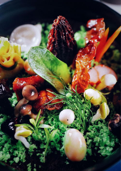 回到香格里拉的森林里,蘑菇?jīng)_破土壤,目光所及之處皆是明朗又蓬勃的大自然氣息。整道菜還原了菌菇原生態(tài)的生長方式,為食客精心設置了一個大自然的場景,這道菜包含28種食材元素,皆可食用。用燈影鴨胸仿造的枯葉作裝飾,是視覺和味覺碰撞的最佳詮釋。