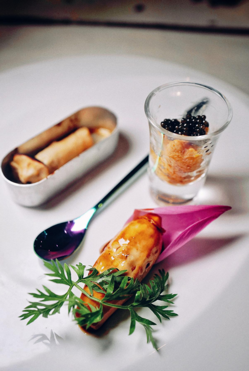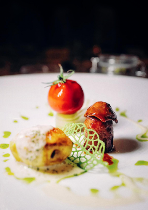 由帥廚親自上陣演繹,開啟晚宴最高潮。鴨皮酥脆鮮亮,鴨肉豐腴肥厚;底部選用正值時令的無花果,一口吃下,無花果的涼,鴨肉的熱和黑松露的香緊緊結(jié)合,味蕾在冷熱交替中被漸漸裹挾,產(chǎn)生不可言說的微妙之感。