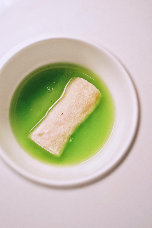 將白水魚的魚茸塞進竹蓀里,加持菌菇熬制而成的湯底,竹蓀釋放自己的獨特氣息。用薺菜加蘆筍調(diào)汁兒,前者的顏色較重,后者則較輕,呈現(xiàn)一派蔥郁的夏日好景,清涼恬靜。吃到這里,口味逐漸淡化,秩序有輕有重,是品味的邏輯。