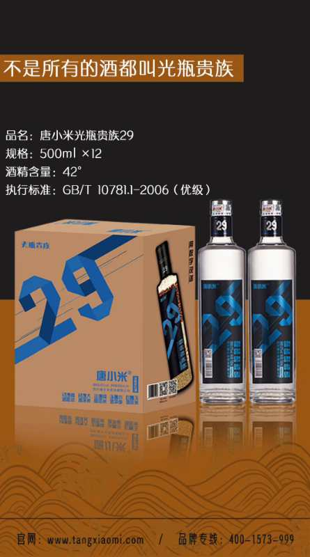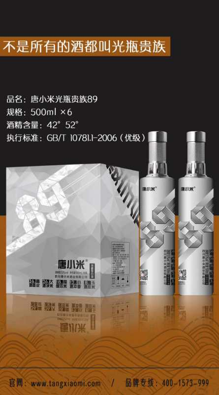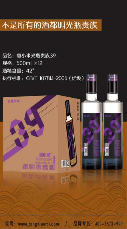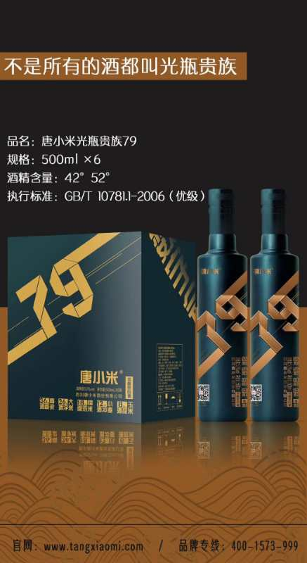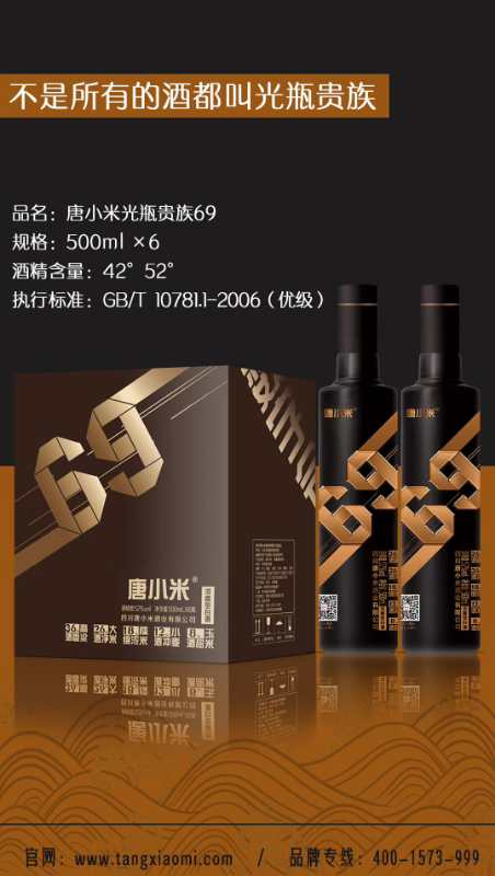 2019年四川唐小米酒業推出“光瓶貴族”系列產品,致力于讓消費者喝到性價比超高的光瓶純糧好酒,超高顏值、專利瓶型、產品特色鮮明。唐小米光瓶貴族延續了川酒瀘州系一貫的高品質和純正口感,進一步突出了“川酒”的優良品質。外部設計采用個性十足的糧食配比含量,數字代表著每種糧食含量,表明著“光瓶貴族”用數字說話的透明,不夾雜任何其它的雜質,整體設計更顯出眾,時尚的設計,在這個用數字說話的時代里更能得到大家的認可。讓消費者在快節奏的社會里,勞碌的生活中,能有一款為消費者著想的產品,往往更能得到人們的喜愛。