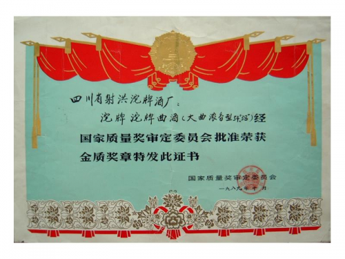 沱牌所獲1989年國家名酒金質獎獎狀