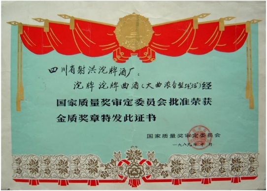 ▲沱牌所獲1989年國家名酒金質(zhì)獎(jiǎng)獎(jiǎng)狀