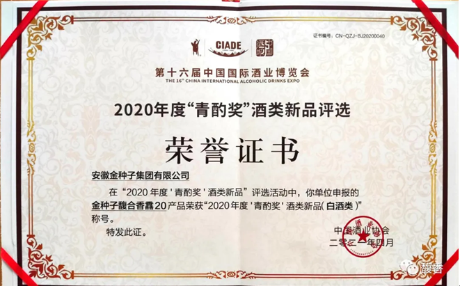 4月9日,由中國(guó)酒業(yè)協(xié)會(huì)主辦的第十六屆中國(guó)國(guó)際酒業(yè)博覽會(huì)在瀘州開(kāi)幕。來(lái)自全國(guó)各酒企的酒類新產(chǎn)品參與評(píng)選,經(jīng)過(guò)層層嚴(yán)格篩選,“金種子馥合香馫20”榮膺2020年度中國(guó)酒業(yè)年度酒類新品“青酌獎(jiǎng)”。