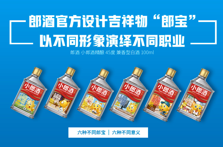 為體現(xiàn)郎酒企業(yè)團(tuán)結(jié)協(xié)作、勇于拼搏、堅(jiān)持品質(zhì)第一,消費(fèi)者第一的核心理念,郎酒官方設(shè)計(jì)郎寶吉祥物形象,演繹不同職業(yè),致敬最可愛的人。此次小郎酒京東聯(lián)名款,郎寶化身運(yùn)動員、教師、農(nóng)夫、白領(lǐng)、快遞員和廚師,六種不同形象的郎寶,詮釋六種不同職業(yè),帶來六種不同意義。小郎酒作為濃醬兼香型小瓶白酒,純糧固態(tài)發(fā)酵,精工釀造,經(jīng)傳統(tǒng)固態(tài)發(fā)酵、蒸餾、陳釀、勾調(diào)而成,口感柔順,在不喜歡醉酒的"新酒飲時(shí)代",小瓶裝二兩正好,有滋有味,品百味人生。