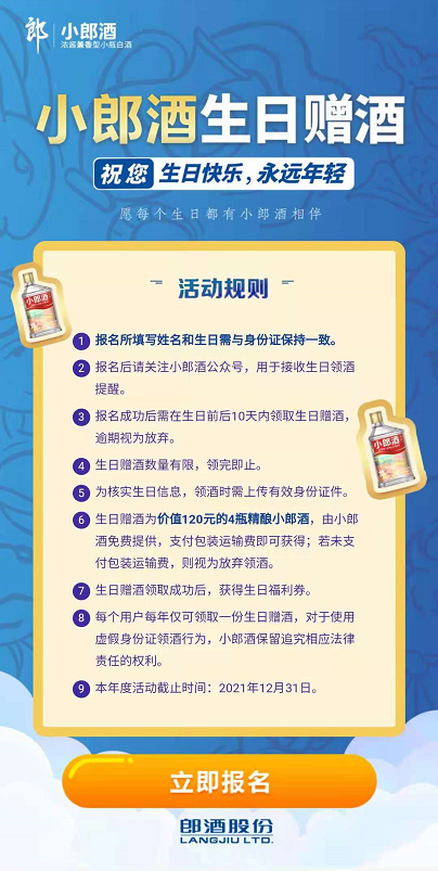 小郎酒助力生日宴,開啟寵粉福利,掃碼報(bào)名參加生日贈酒,價(jià)值120元的4瓶精釀小郎酒送到家。報(bào)名后記得關(guān)注小郎酒微信公眾號,生日領(lǐng)酒提醒將會通過公眾號推送,并需在生日前后10天內(nèi)領(lǐng)取生日贈酒,逾期則視為自動放棄。每位用戶每年僅限領(lǐng)取一次,注意報(bào)名所填寫的姓名和生日需與身份證保持一致哦。本次活動截止時(shí)間2021年12月31日,數(shù)量有限,先到先得,領(lǐng)完即止。