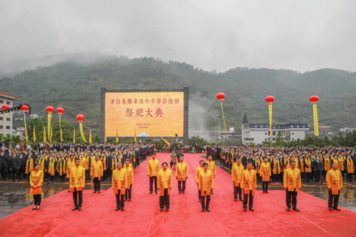 今晨的茅臺飄著小雨,赤水河流澄碧。茅臺集團總部辦公大樓廣場周恩來總理金黃色塑像前,茅臺人和嘉賓以方陣整齊排列,肅穆以待茅臺集團“辛丑牛年茅臺酒節祭祀祖師宗師大典”,巨幅宗師圖像后,“酒香、風正、人和”六個字異常醒目。