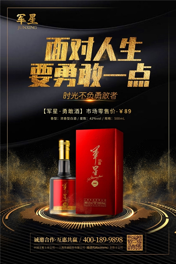 10月26日,上海軍酒有限公司新品軍星勇敢42%vol濃香型白酒震撼上市,每瓶僅售89元!硬朗的瓶身設計、超值的品質體驗、超高的性價比,帶給消費者燃爆味蕾的享受。本次上市的軍星勇敢酒是繼今年