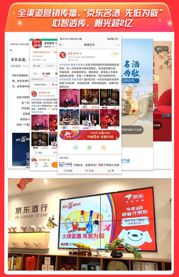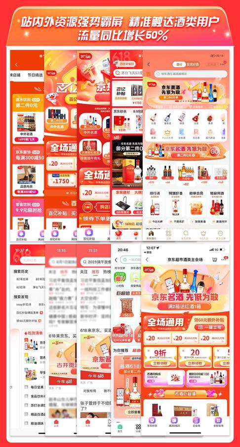 在京東618期間,京東超市站內外資源強勢霸屏,精準觸達酒類用戶,流量同比增長50%。在全渠道營銷傳播加持下,京東名酒“先低為敬”,曝光超2億,深受消費者歡迎。