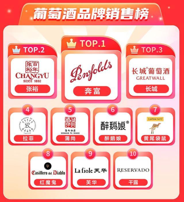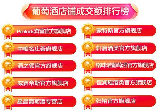 在葡萄酒店鋪成交額排行榜方面,Penfolds奔富官方旗艦店、蒙特斯官方旗艦店、中糧名莊薈旗艦店、軒唐酒類官方旗艦店、酒之領官方旗艦店、格味諾葡萄酒官方旗艦店、威賽帝斯官方旗艦店、恒潤瑤酒類官方旗艦店、星晨葡萄酒專營店、張裕官方旗艦店均上榜。