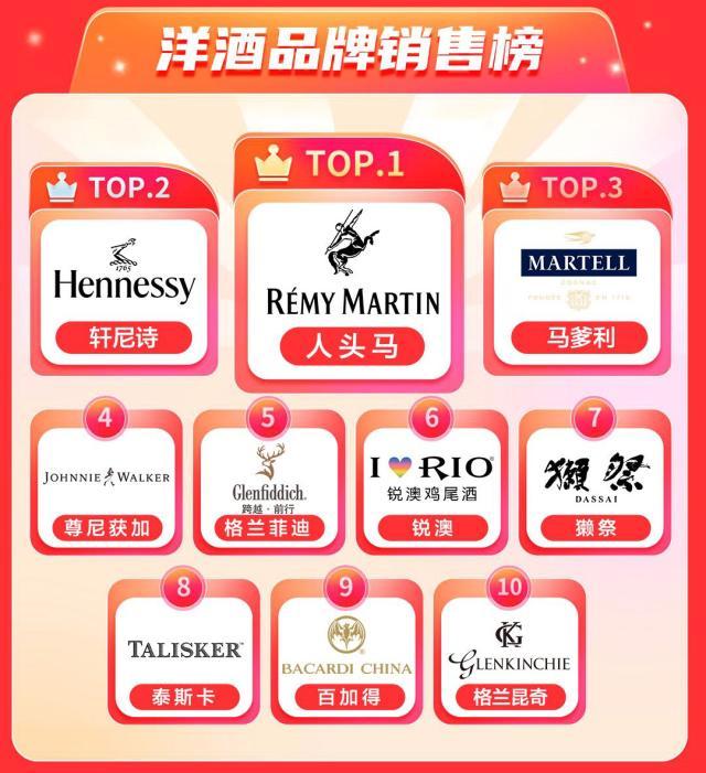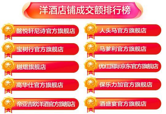 酩悅軒尼詩官方旗艦店、人頭馬官方旗艦店、寶樹行官方旗艦店、馬爹利官方旗艦店、樾熠旗艦店、優紅國際京東官方旗艦店、高華仕官方旗艦店、保樂力加官方旗艦店、帝亞吉歐洋酒官方旗艦店、酒盛宴官方旗艦店,進入洋酒店鋪成交額排行榜十強。