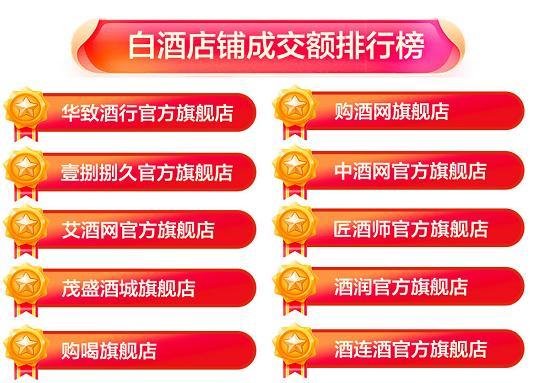 此外,華致酒行官方旗艦店、購酒網旗艦店、壹捌捌久官方旗艦店、中酒網官方旗艦店、艾酒網官方旗艦店、匠酒師官方旗艦店、茂盛酒城旗艦店、酒潤官方旗艦店、購喝旗艦店、酒連酒官方旗艦店,進入白酒店鋪成交額排行榜十強。