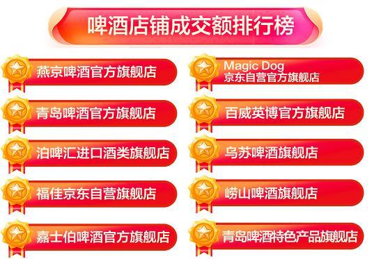 燕京啤酒官方旗艦店、Magic Dog京東自營官方旗艦店、青島啤酒官方旗艦店、百威英博官方旗艦店、泊啤匯進口酒類旗艦店、烏蘇啤酒旗艦店、福佳京東自營旗艦店、嶗山啤酒旗艦店、嘉士伯啤酒官方旗艦店、青島啤酒特色產品旗艦店,成為啤酒店鋪成交額排名前列店鋪十強。